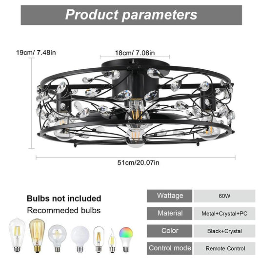 20In Caged Ceiling Fan with Light, Crystal Rustic Ceiling Fans with Remote, Bladeless Black Ceilingfan, Flush Mount Fanlights for Kitchen Bedroom