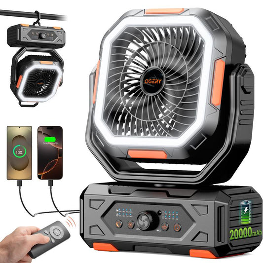 2025 Upgraded Camping Fan – 20000Mah Rechargeable Battery, LED Light, 270° Adjustable Head, Remote-Controlled Oscillating Desk Fan for Tents, Travel, and Home Use